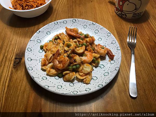2019-67 珠兒的甜豌豆與明蝦貝殼麵 檸檬說很久沒吃到有豆豆的義大利麵了,嗯,哇哉,媽媽認命去買食材,還好只有青豆需要補貨,貝殼麵先用櫃子裡的貓耳朵代替。